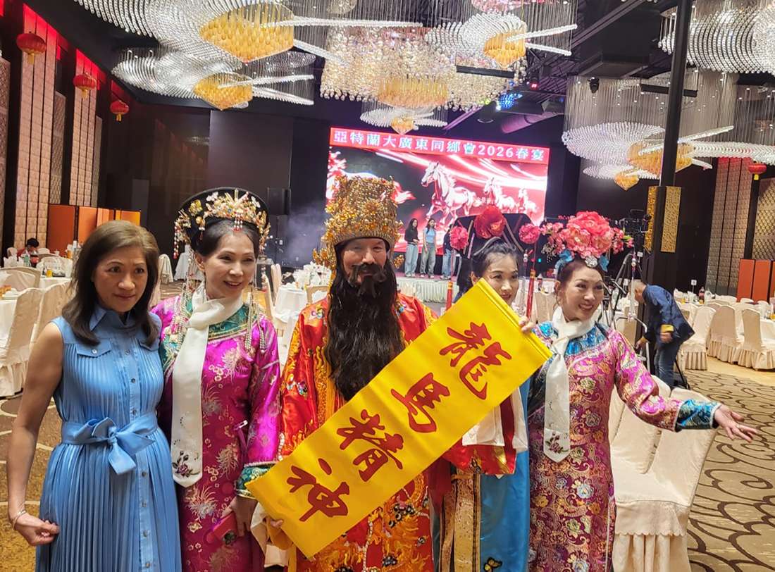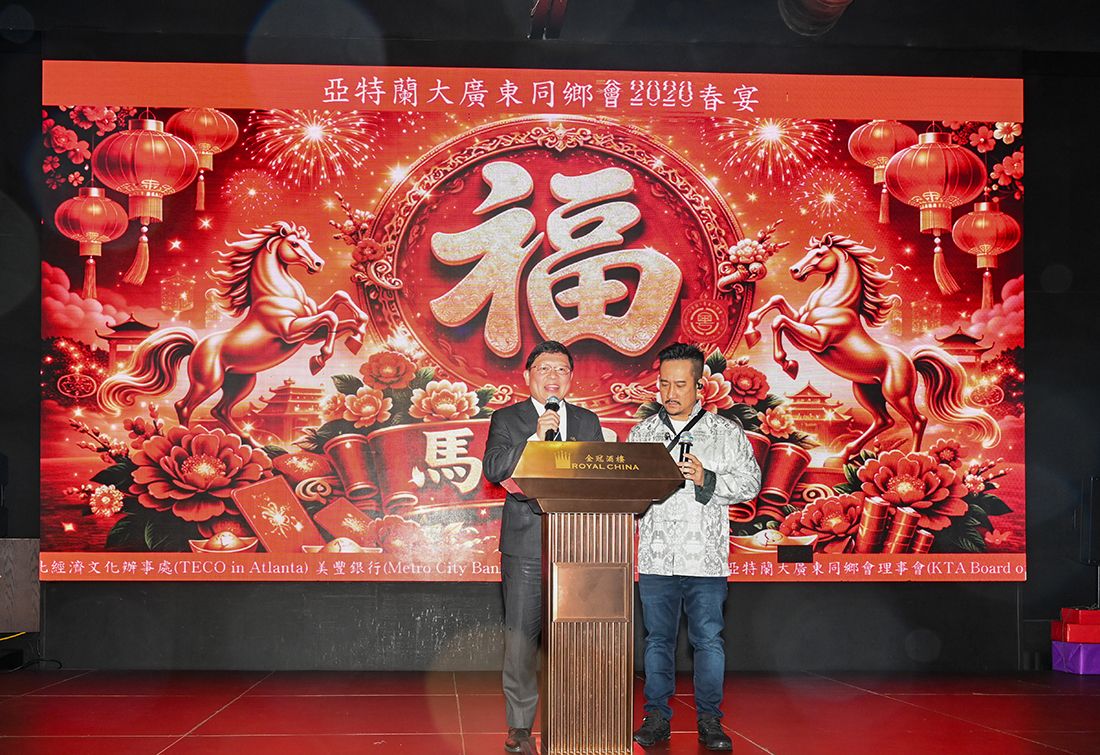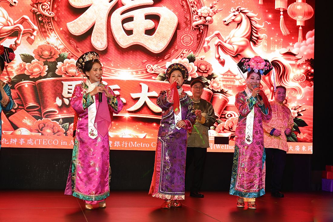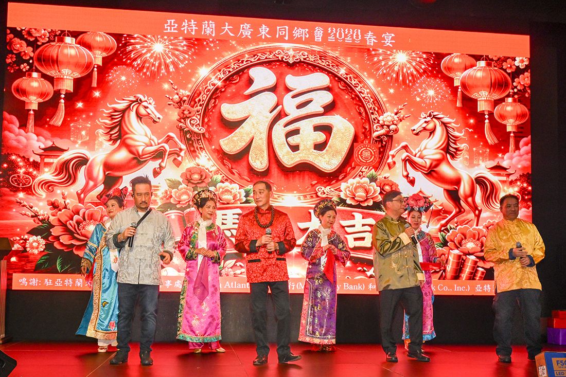 当晚春宴由裴武龍先生與謝徽音女士共同主持。宴會序曲在廣東同鄉會廣東文藝團唱賀年歌拉開帷幕。沙國華會長首先致開幕辭,並帶領全體理監事向來賓拜年,祝各位來賓馬年大吉,馬到功成。拜年後,財神爺陳寵徳,徐亮女士和李玉英女士向來賓派發利是。廣東同鄉會贈送的賀年利是﹐象徵馬年大吉大利,恭喜發財。随后,駐亞城台北經文處林主恩處長上臺致詞和拜年。
