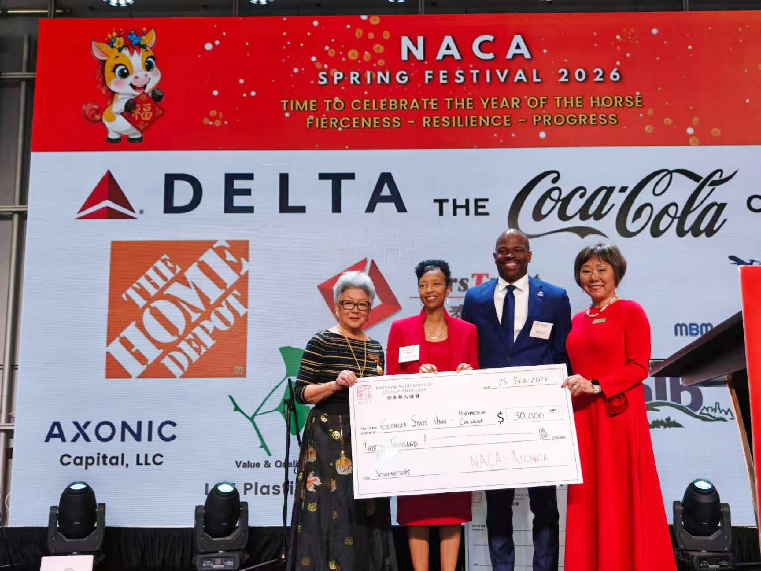 值此春節晚宴良機,全美華人協會再一次通過回饋社會來弘揚其“架構文化橋樑、培養未來領導、回饋造福社區”的三大宗旨。该会在晚宴上向Georgia State University Perimeter College捐贈3萬美元;柯氏家族基金会向两位优秀学生各颁发了1万美元。
