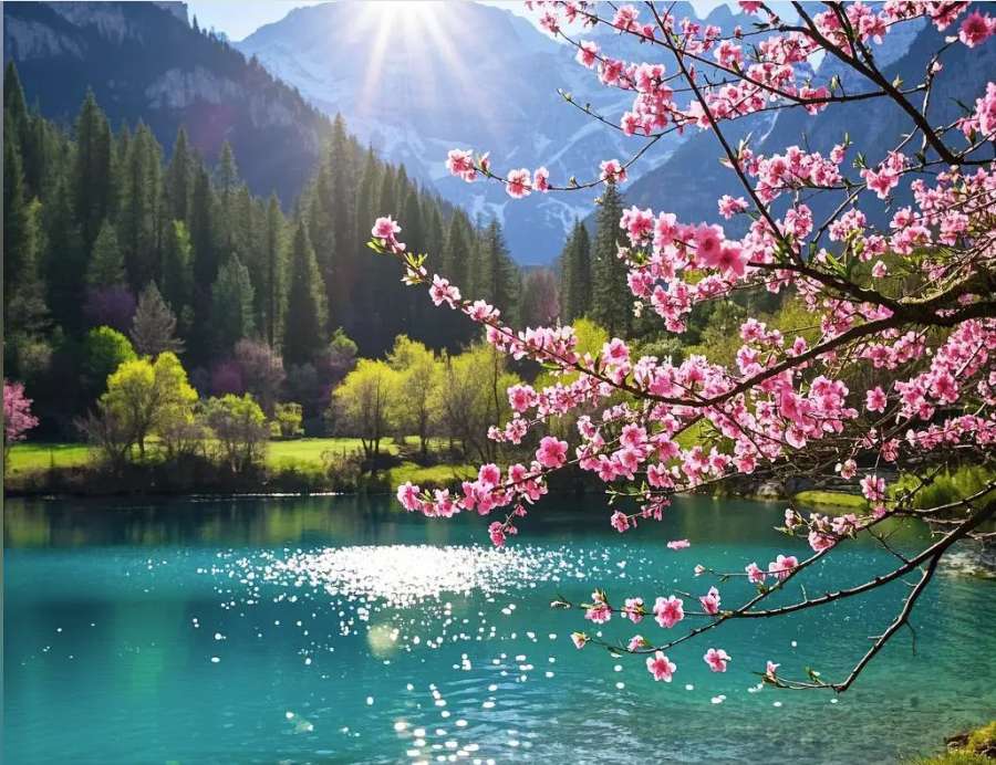 春天来了,天气渐渐暖和,桃树冒出了一个个花骨朵。几天后,有些花骨朵悄悄张开了花瓣。花瓣的颜色是渐变的,越靠近花芯颜色越深,越偏向红色,而花瓣边缘却几乎是白的。每一朵花都有五片花瓣,深粉色的花芯像一颗小小的红色五角星。