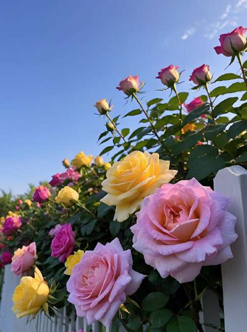 一看到玫瑰花,我就觉得它们像一位位优雅的公主。红色的玫瑰骄傲地站着,好像在展示自己;粉色的玫瑰轻轻地微笑,看起来温柔又安静;黄色的玫瑰则像在热情地和我们打招呼。它们的花瓣一层一层地展开,就像一条条漂亮的裙子,仿佛正准备参加一场盛大的舞会。