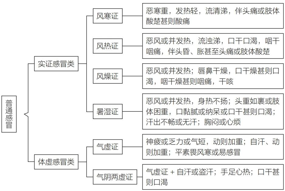 感冒的中医证型包括实证感冒类(风寒证、风热证、风燥证、暑湿证)和体虚感冒类(气虚证、气阴两虚证),共两类六证候。