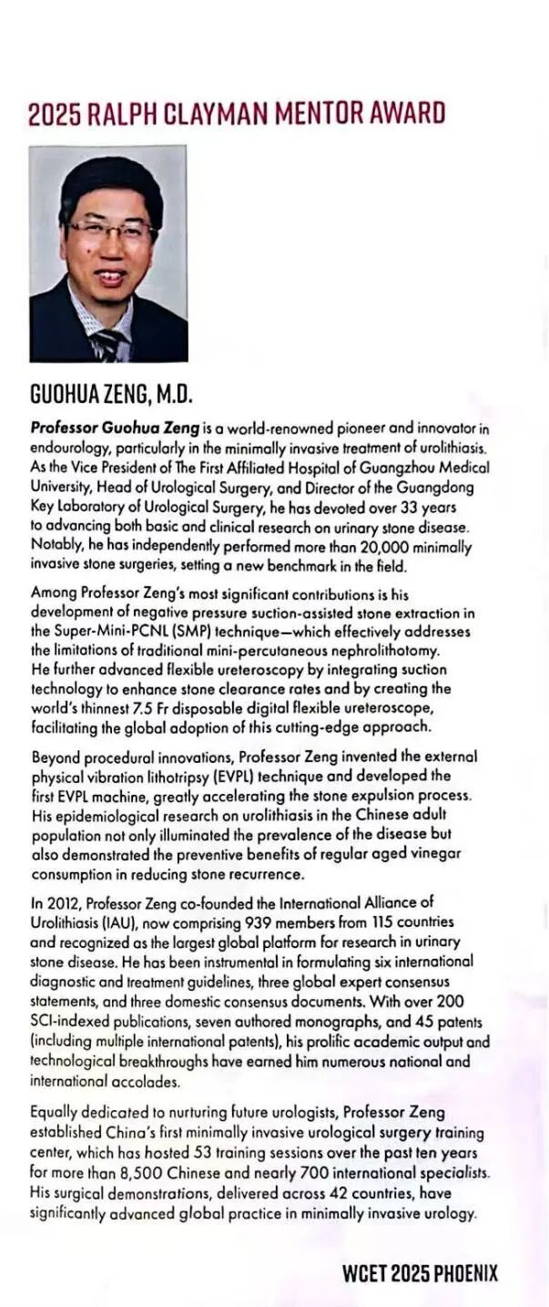 2025年9月8日至12日,第42届国际腔内泌尿外科和泌尿技术大会(WCET)在美国凤凰城盛大召开。作为全球泌尿外科领域的顶级盛会,本次大会汇聚了世界各地的权威专家与学者。在这场万众瞩目的学术盛宴上,广州医科大学附属第一医院副院长、泌尿外科学科带头人——曾国华教授,不仅带领团队展示了最新研究成果,更以卓越的学术贡献与人才培养成就,荣获2025年度国际腔内泌尿外科协会(Endourology Society,ES)最高荣誉奖之一——Ralph Clayman Mentor Award。这是中国医生首次获得该奖项,标志着中国力量在国际泌尿外科学术舞台上取得历史性突破。这一荣耀,堪称“国人之光”!