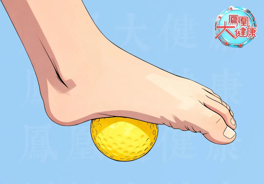 找一颗拳头大小、质地偏硬的球,放在足弓下方,站姿下单脚踩在球上,稍加施力,让球滚动按摩到足底的肌肉群与筋膜,感觉微微酸痛就好,千万不能有刺痛感。