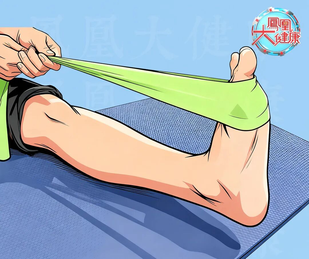我们采用坐姿,将毛巾或者弹力带放在脚趾下,用脚趾弯曲、脚掌下压的方式来和上肢进行力量对抗,从而训练脚踝和脚部的肌肉。(凤凰大健康)