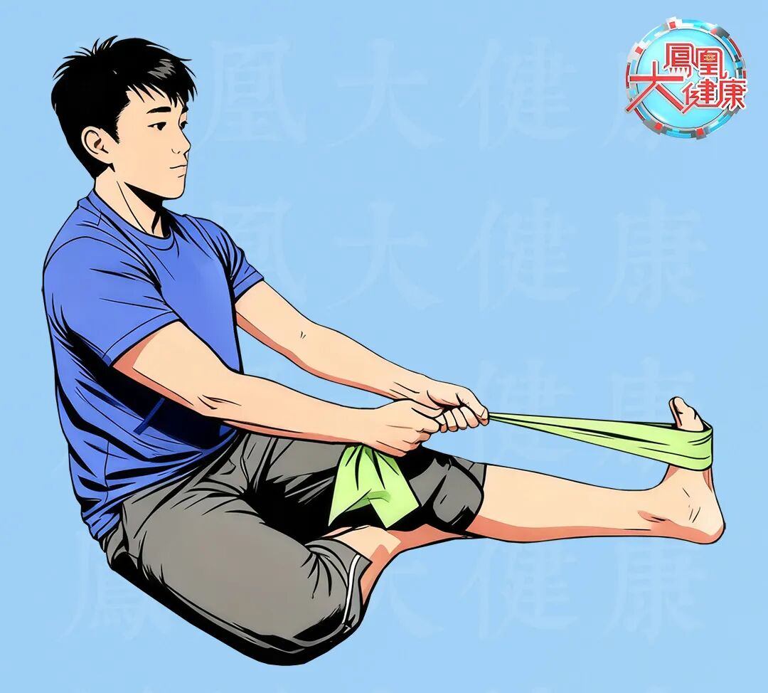 我们采用坐姿,将毛巾或弹力带放在足底,用毛巾带动脚掌向上勾,膝盖尽量伸直。保持30秒后放松,重复三次。