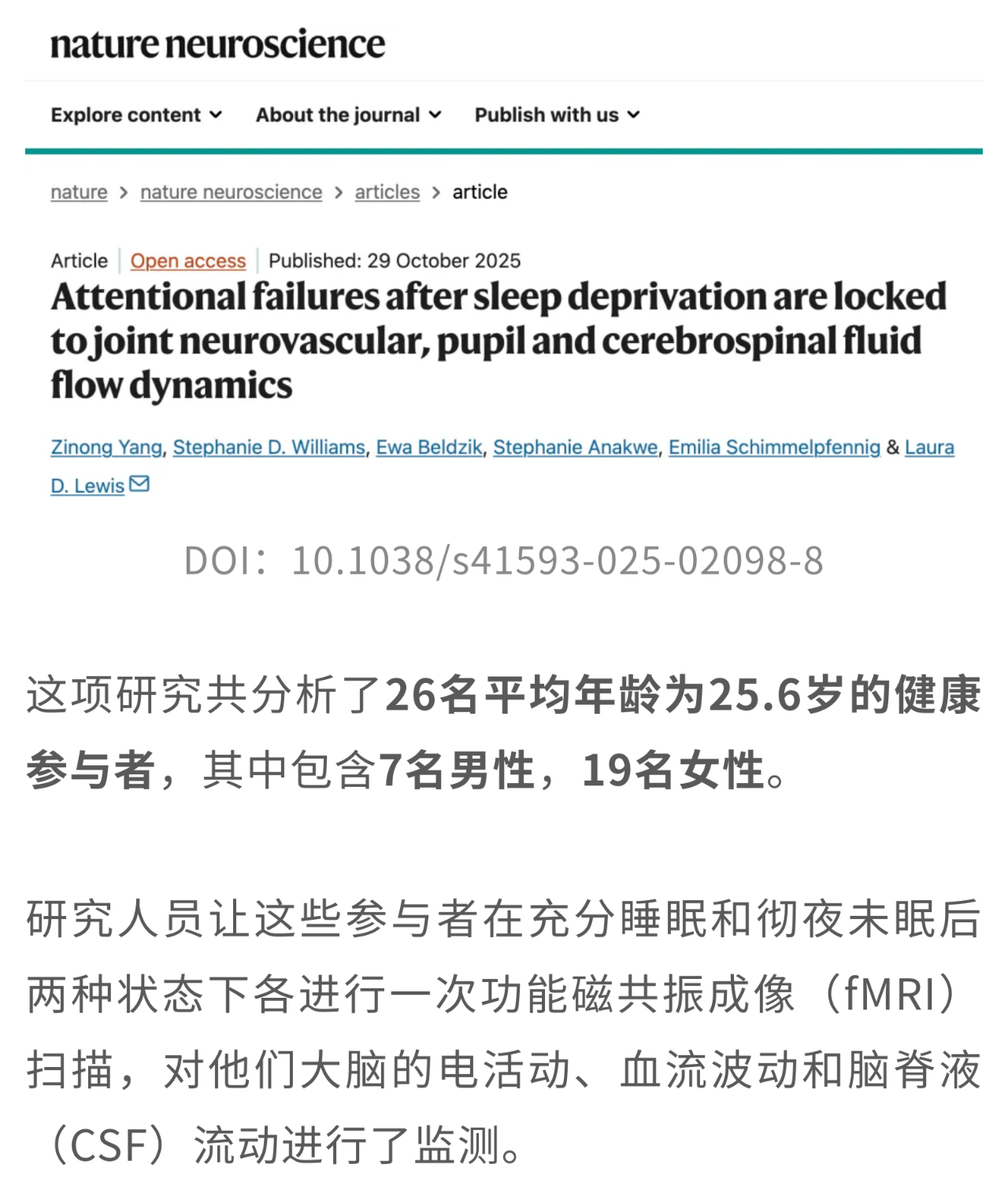 但麻省理工学院和波士顿大学的研究团队一项发表于Nature子刊Nature Neuroscience的最新研究[2]还是劝退了一大波认为「熬夜并不会影响第二天工作」的「夜猫子」。这项研究发现,当我们熬一夜不睡,注意力会出现下降。即使强打精神保持清醒,大脑也会执行睡眠时才该进行的“垃圾清理任务”,神经活动紊乱、瞳孔收缩、脑脊液剧烈涌动。