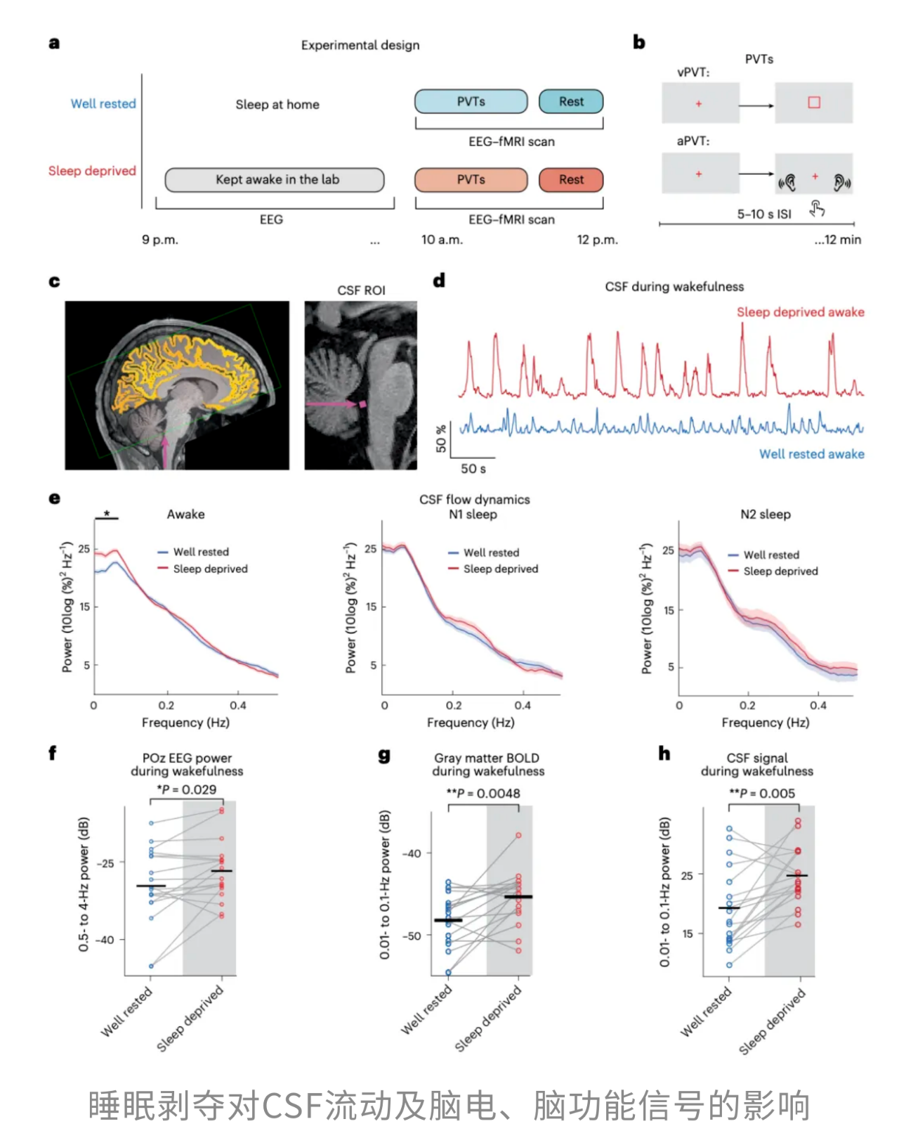 通常情况下,人在清醒的时候,CSF像温柔的小溪,会随着呼吸轻轻波动;而在非快速眼动睡眠(NREM)中,它会像海浪一样,出现大幅度、低频的起伏。可是,研究发现,当参与者经历一夜睡眠剥夺后,即使仍处于清醒状态,他们的CSF信号也出现了类似NREM睡眠的波动,对任务的反应时间也明显变慢。