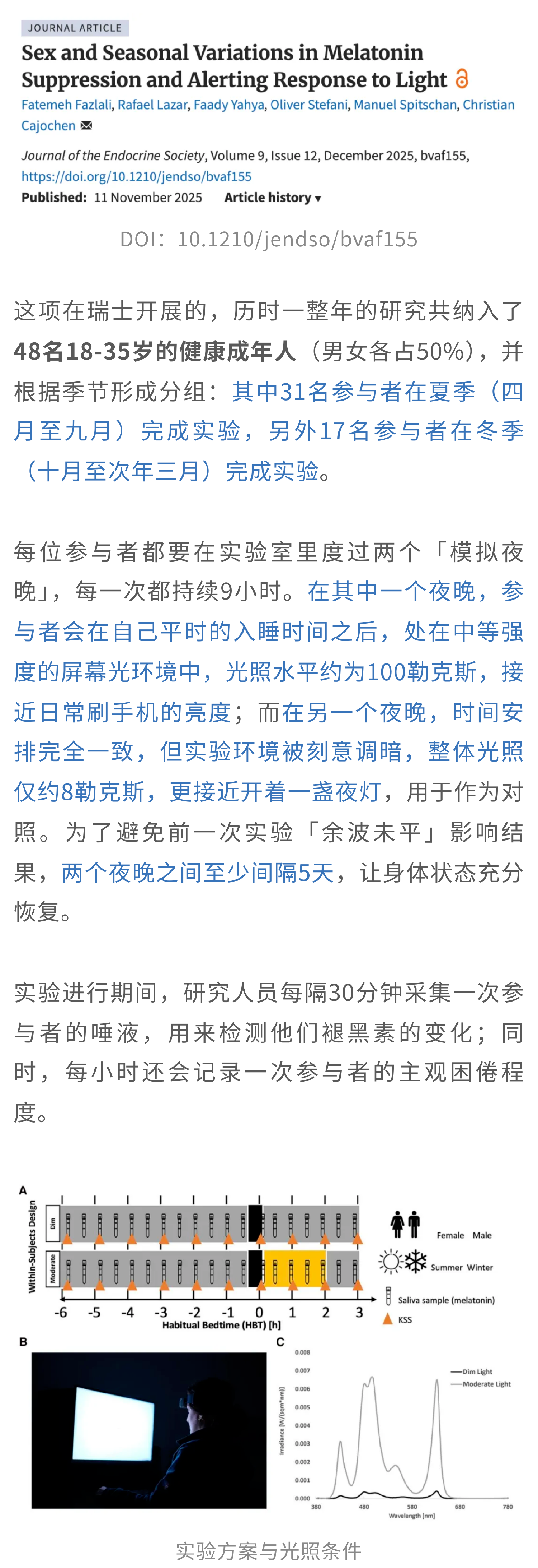 近期,来自瑞士巴塞尔大学等机构的研究团队发表于Journal of the Endocrine Society的一项研究[1]指出:由于冬季白天自然光照明显不足,人体的生物钟会变得格外「脆弱」,对夜间光线异常敏感。也就是说,同样是刷手机熬夜,这件事放在冬天,会更猛烈地抑制褪黑素分泌,更粗暴地搅乱生物节律,让入睡变难、醒来更困。