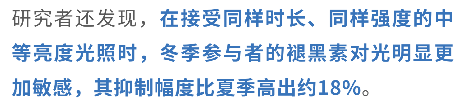 这也就意味着,冬季白天光照偏少,使机体长期处在一种「光储备不足」的状态;因此到了夜晚,同样是熬夜刷屏,却容易引发更强烈的褪黑素抑制,并带来更加明显的提神效果。