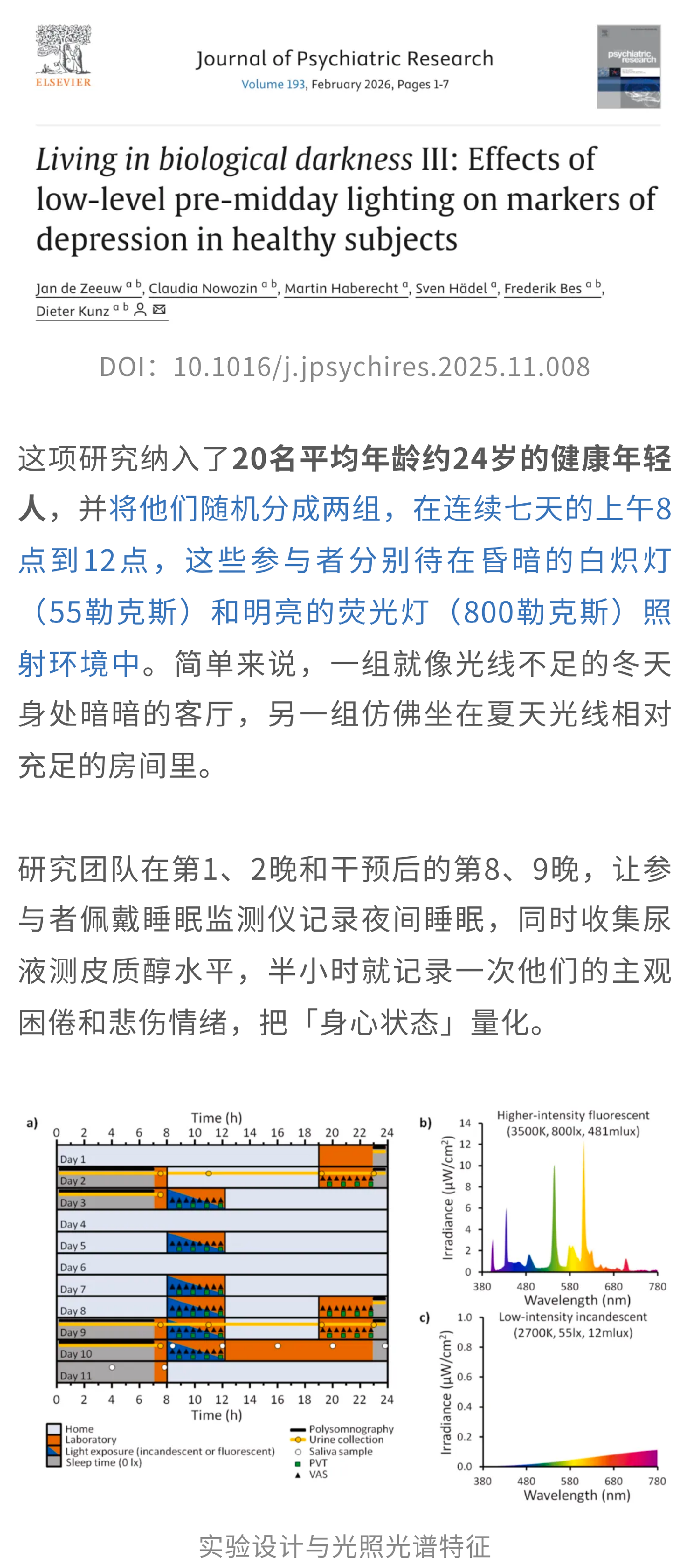 随着时间推移,到了第8天,低强度白炽灯组的参与者主观悲伤程度甚至也显著高于高强度灯光组。研究者指出,这些变化与抑郁症患者的生理特征相似。