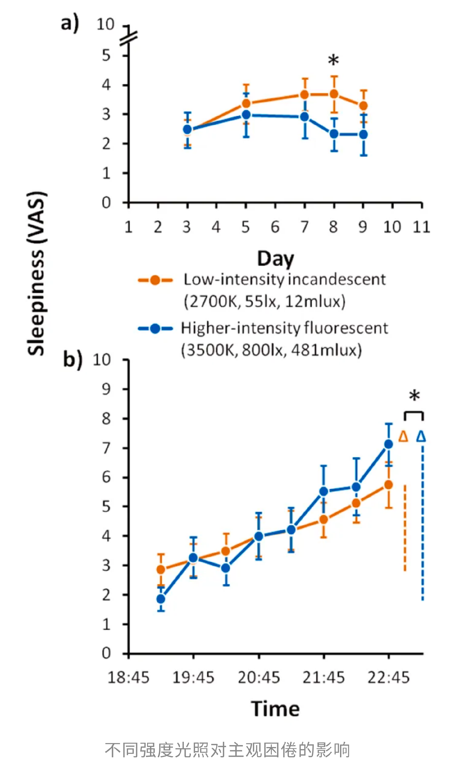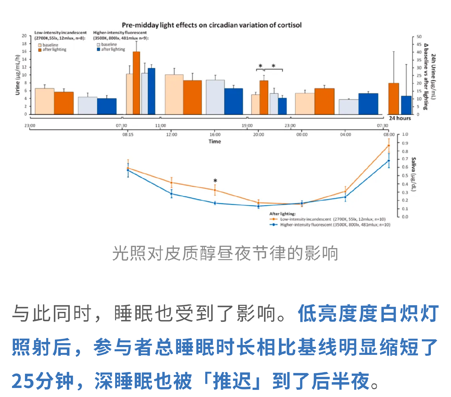 而低亮度白炽灯组参与者次日早晨的皮质醇水平依然略高于高亮度荧光灯组的参与者。