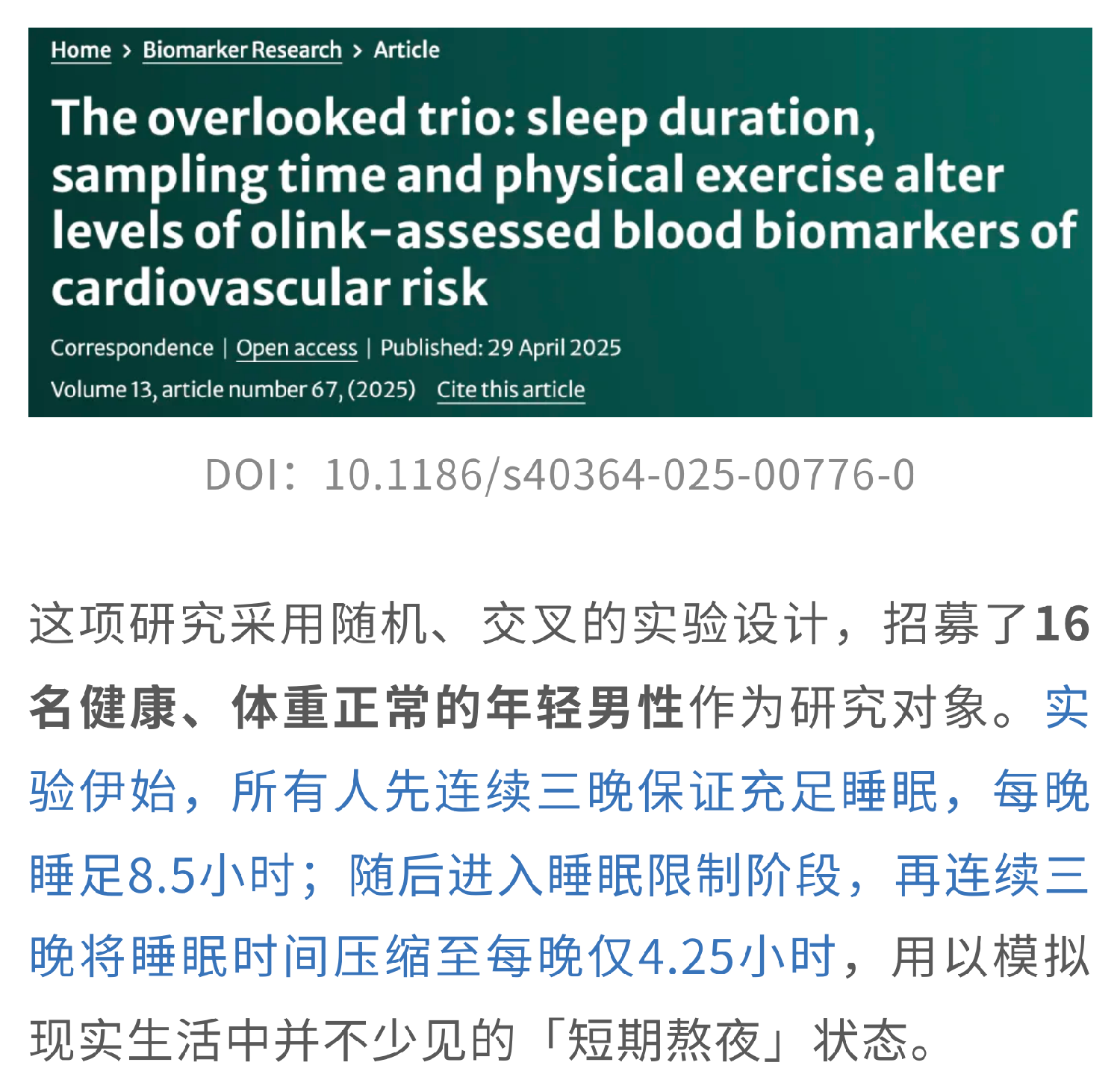但来自瑞典斯德哥尔摩大学、中国科学技术大学等机构的研究团队去年发表于Biomarker Research的一项研究[3]发现,哪怕只是短期睡眠不足,血液中与心血管疾病风险相关的多种蛋白质水平就已经开始发生变化。一方面,一些与心力衰竭等心血管疾病风险升高密切相关的生物标志物会明显上升;另一方面,睡眠不足还会削弱运动本该带来的有益分子反应,让原本应当「加分」的锻炼效果大打折扣。