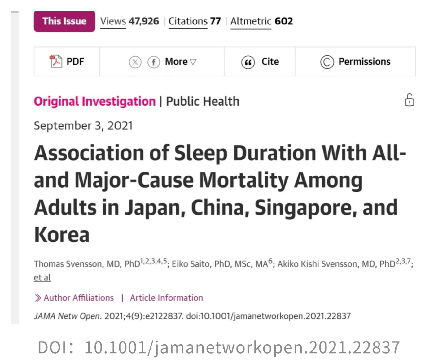 此前,一项发表于JAMA Network Open、涵盖超32万名成年参与者的大型队列研究[5]指出,在东亚成年人中,睡眠时间与全因死亡率之间呈现出一种「J型」曲线。睡得太少或睡得太多,都有可能提高全因死亡风险,而7小时的睡眠恰好是风险最低的「黄金时长」。