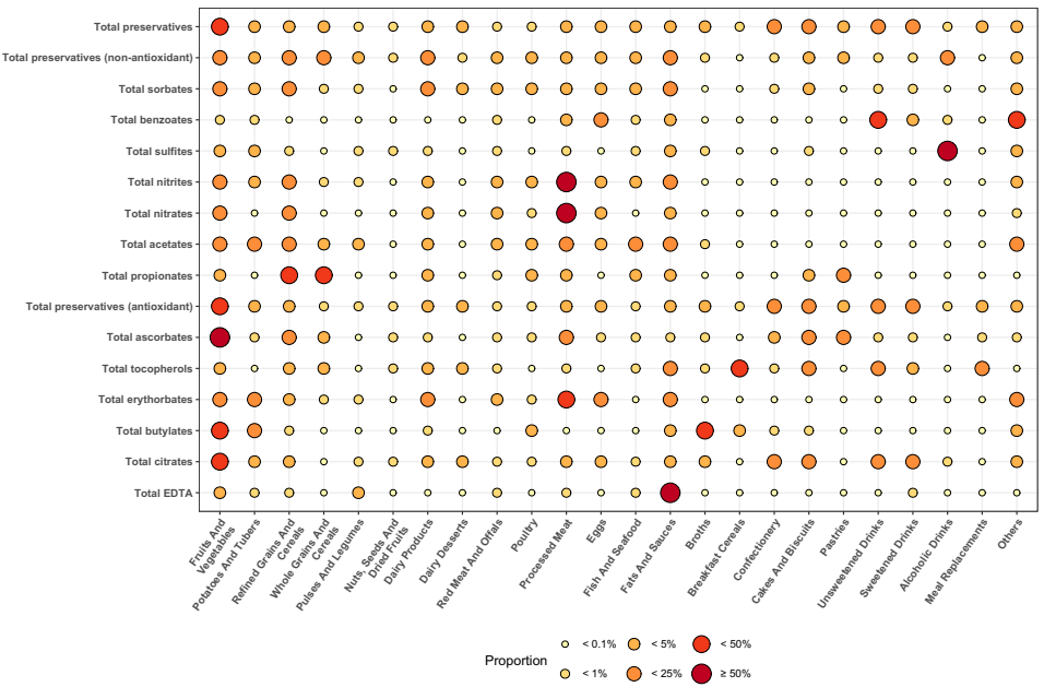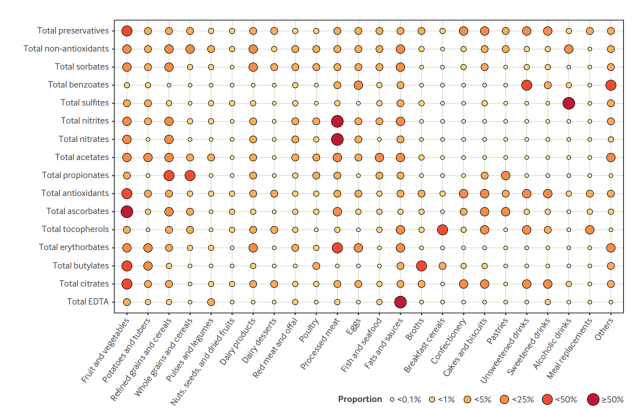 4.风险来源与模式:虽然约34.6%的防腐剂摄入量来源于“超加工食品”,但在统计模型中调整超加工食品比例后,上述关联依然牢固,这提示风险很可能直接源自防腐剂本身,而非仅仅是伴随超加工食品的不健康饮食模式。此外,不同防腐剂在食物中的分布各有侧重:
