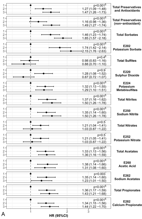 3.锁定具体“嫌疑对象”:在进一步对摄入较普遍的17种防腐剂进行逐一分析后,13种显示出与糖尿病风险的显著正相关。并且,即便经过严格的统计学多重检验校正,它们的“风险信号”依然明确,包括: