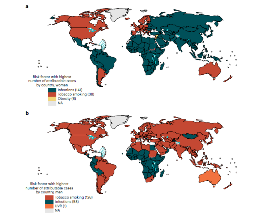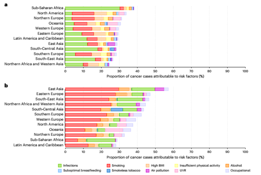 为了搞清楚全球癌症背后的真相,研究团队从GLOBOCAN全球癌症数据库中提取了2022年185个国家的36种癌症数据,然后为每一种癌症“追根溯源”——对照吸烟、饮酒、肥胖、感染、空气污染等30种可改变的风险因素,计算每个因素在癌症发病中到底“贡献”了多少。