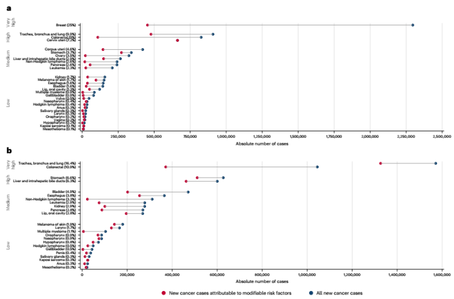 除了吸烟和感染,肥胖、久坐和不良饮食正在成为新的致癌推手。数据显示,高体重指数与多种癌症密切相关,尤其是乳腺癌和子宫内膜癌;体力活动不足同样增加肿瘤风险。在女性乳腺癌的可归因因素中,运动不足、超重和饮酒都占了相当比例。