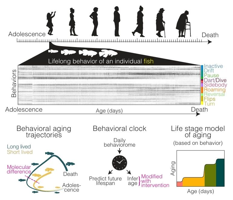 通过这些数据,研究人员构建了一个高分辨率的行为图谱。他们将鱼类的运动和休息行为分解为约100种重复出现的基本动作单元,这些动作构成了动物日常行为的基本“词汇”。在此基础上,研究人员得以系统分析行为随年龄变化的模式,并分析这些变化是否与最终寿命相关。