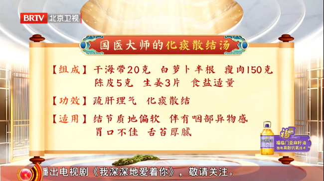 【适用人群】结节质地偏软,伴咽部异物感,胃口不佳,舌苔厚腻。