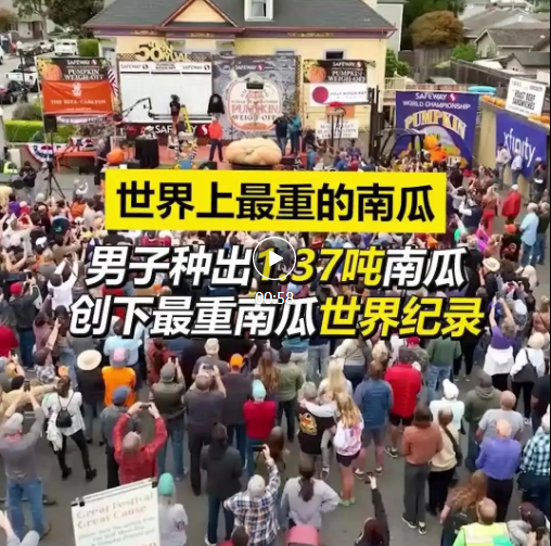 10月9日,明尼苏达州的一名男子种出了2749磅/1.37吨重的南瓜,创下了最重南瓜的世界记录。该南瓜种植者是一名园艺老师,去年就凭一颗2560磅/1.16吨重的南瓜夺得加州半月湾Safeway世界锦标赛南瓜秤重比赛(Safeway World Championship Pumpkin Weigh-Off)的冠军。男子在今年的比赛中更是打破了最重南瓜的世界记录,并获得了3万美元的奖金。(素材来源:KTTV)(凤凰美洲)