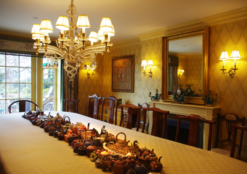 桌上摆放的各式茶壶,是请了中国手工艺人们为她特别定制的。