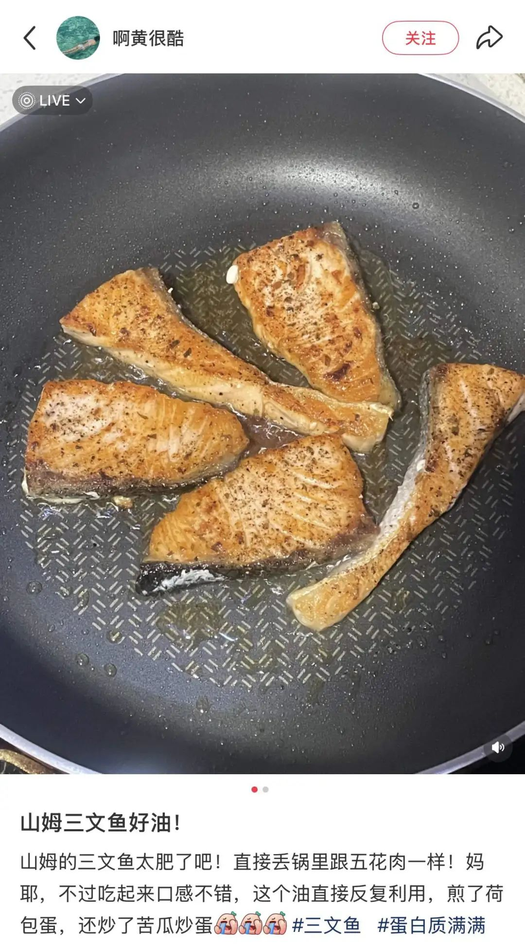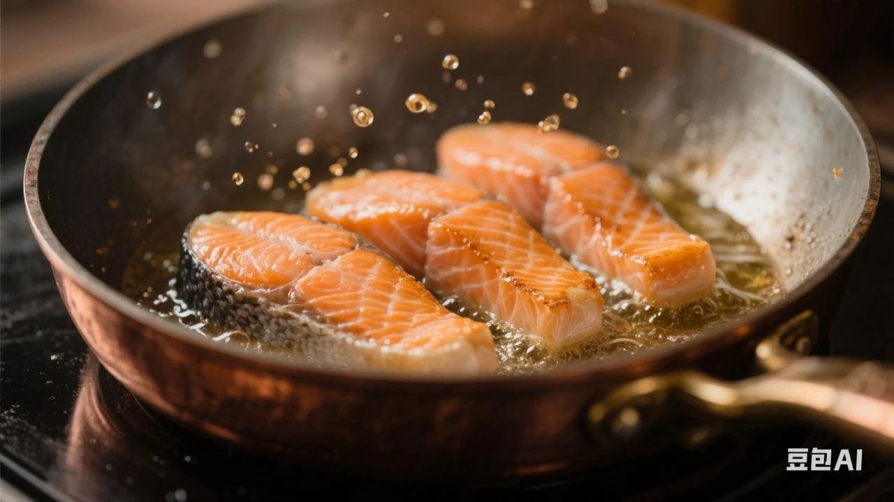 最近有网友分享了自己做油煎三文鱼的经历,可是煎到后面画风就开始不太对劲了。明明只放了一点点橄榄油,结果三文鱼边煎边出油,最后从油煎变成了油炸,三文鱼完全泡在一片“油泊”中。