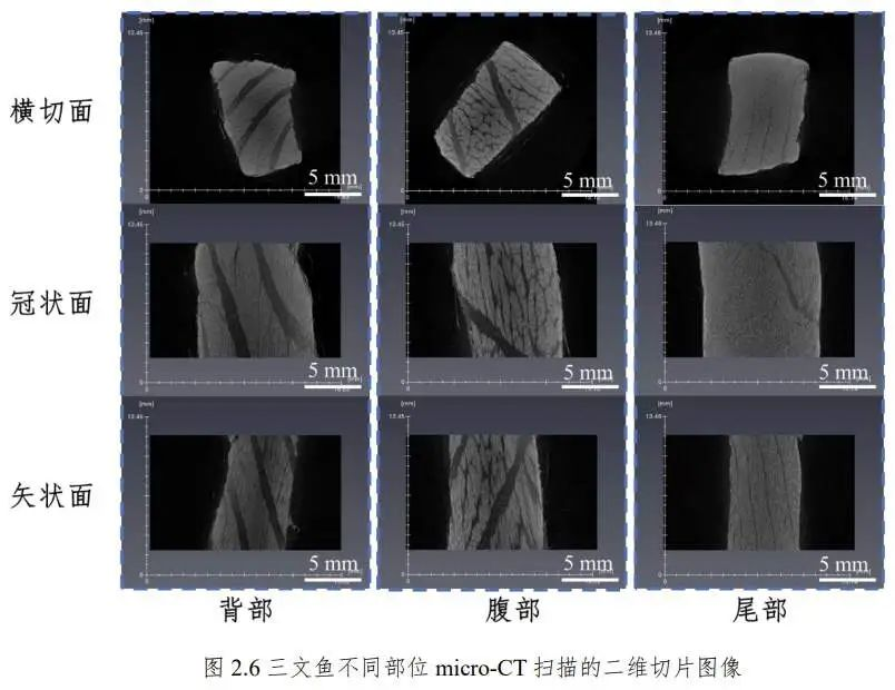 浙江大学的一篇论文运用micro-CT成像对三文鱼不同部位的结构进行了分析,发现背部和尾部的肌肉组织结构规整、排列规律,可腹部却出现明显的大理石纹状脂肪堆积,说明三文鱼腹部脂肪相较背部和尾部要更多。