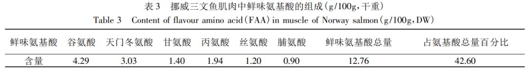 三文鱼肌肉中蛋白质的氨基酸组成非常全面,含18种氨基酸,其中有8种人体必需氨基酸。同时动物蛋白质的鲜美在一定程度上取决于其鲜味氨基酸的组成和含量,谷氨酸和天门冬氨酸通常是鲜味呈现的特征氨基酸。《挪威三文鱼的营养评价》一文分析了三文鱼肌肉中鲜味氨基酸的组成,总含量为12.76%,占氨基酸总量的42.60%,因此三文鱼的鱼肉吃起来细腻鲜美。