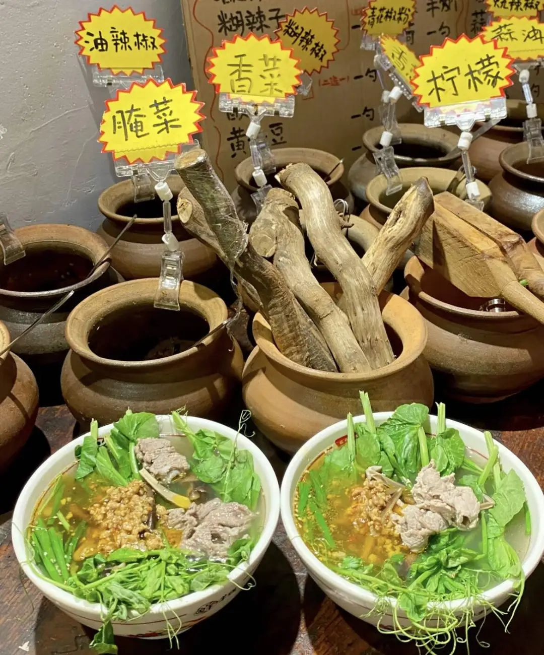 当然,还有开头提到的一些米线,也会加木姜子根,比如云阿蛮生烫牛肉米线,就会给自家米线现场刮木姜子根。