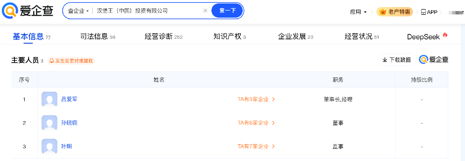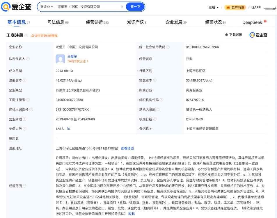 爱企查App显示,汉堡王(中国)投资有限公司成立于2013年9月,法定代表人、董事长为吕爱军,注册资本约4.6亿美元,经营范围包括食品流通、食品原料、餐饮设备器具、礼品、服饰、玩具、工艺品、家具、办公用品及日用杂货的进出口、销售、批发、佣金代理等。