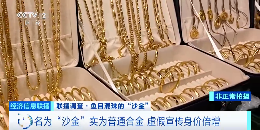 出厂价10元左右的黄铜镀金首饰,到了街头夜市上,就摇身一变成了40元左右的“沙金”首饰。而在网上的直播间里,更是被主播包装成所谓越南提纯“沙金”,一件首饰卖到上百元。也就是说,虽然“沙金”的名称,给人一种天然黄金副产品的印象,但实际上,当前市面上销售的绝大多数所谓“沙金”饰品,与黄金并无关系。浙江义乌的商户还告诉记者,虽然网上大肆宣传所谓的“沙金”饰品内外一色、火烧后仍然是金色,事实并非如此。