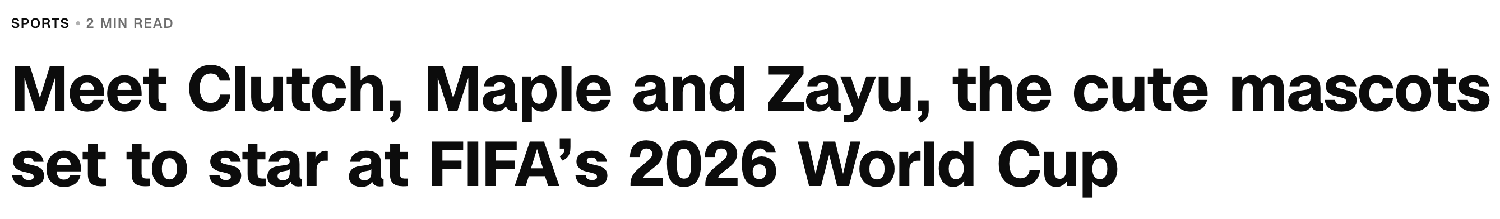 2026年国际足联世界杯的官方吉祥物正式亮相,由代表主办国美国、加拿大和墨西哥的三位动物组成:白头鹰“克拉奇”(Clutch)、驼鹿“梅普尔”(Maple)和美洲虎“扎宇”(Zayu)。