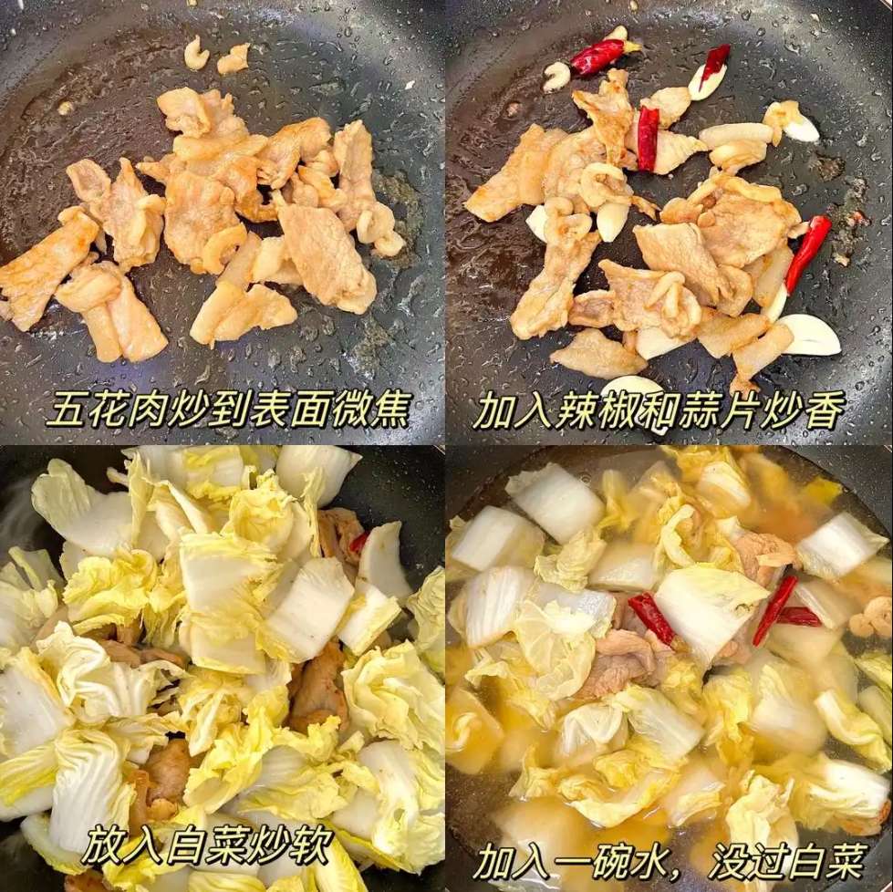鍋裏放少許油,放五花肉,爆香蒜末和幹辣椒,放入白菜翻炒到變軟出水,加兩勺生抽、一勺蠔油調味。