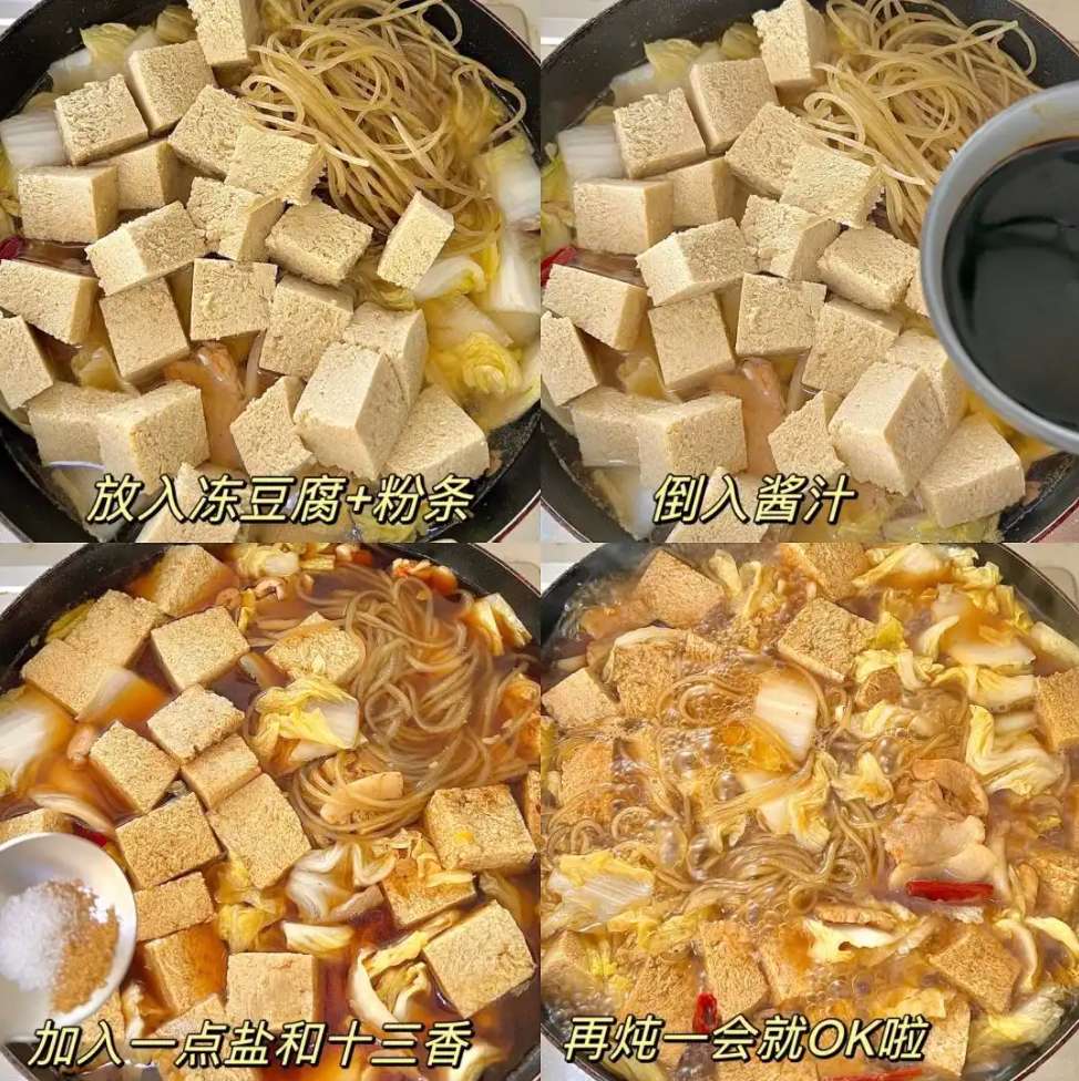 放入凍豆腐和粉條,加適量清水沒過食材,大火燒開後轉小火,蓋上蓋子燉十分鐘。等粉條吸飽湯汁,白菜變得軟爛,撒點蔥花就能端上桌了。