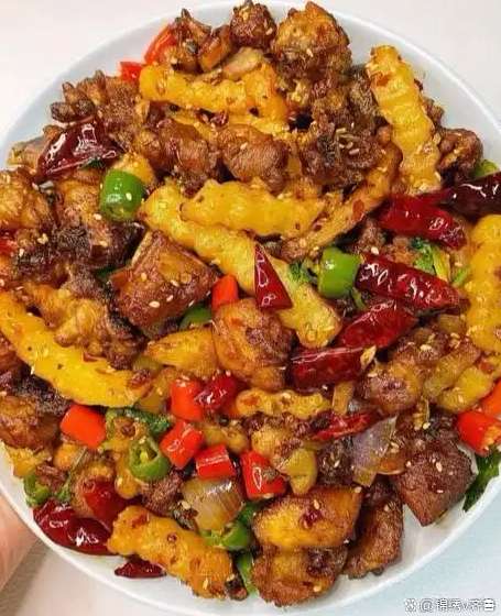 2.小鍋倒油燒至六成熱,先下土豆片炸至邊緣金黃撈出,再升油溫至七成熱,下藕片複炸30秒,形成焦殼,最後倒入醃好的雞塊,炸至表面微幹鎖汁,全部撈出瀝油。