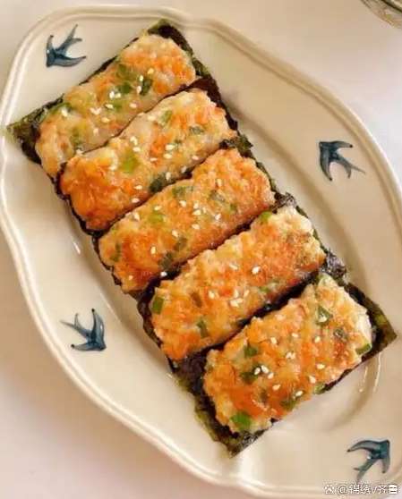 2.包裹技巧:紫菜剪成小片,抹上蝦泥卷成卷。