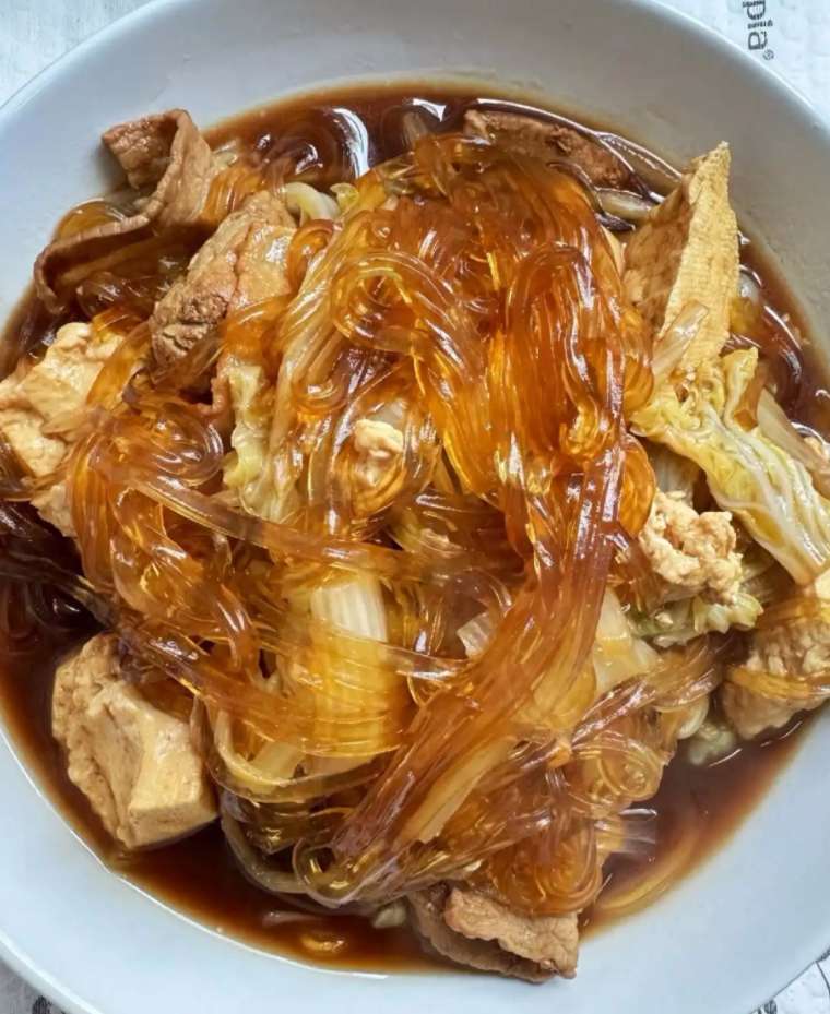 3、放入大白菜,翻炒至變軟,加入適量清水,放入豆腐塊,蓋上蓋子,小火燉5分鐘,加入1勺鹽、1勺雞精、1勺胡椒粉,放入泡好的粉條,再次燉5分鐘即可出鍋。