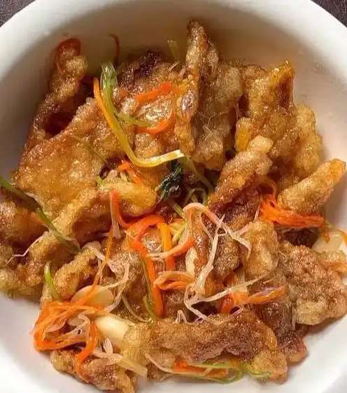裏脊肉、土豆澱粉;配料:薑絲、香菜、胡蘿蔔絲;調料:鹽、料酒、番茄醬、白糖、白醋