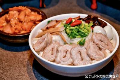 用豬大腸熬制的濃白高湯,泡著掰碎的饃,撒上蒜苗、粉絲,肥而不膩。