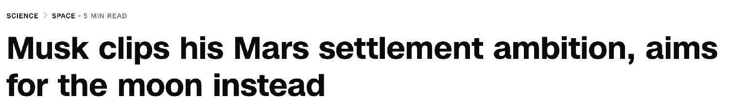 CNN报道,马斯克一直喊着要把人类送去火星,但现在看起来,他的重心正在往月球转。