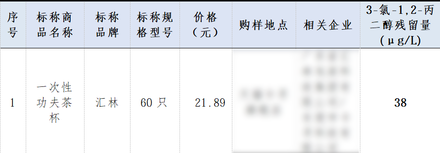 上海消保委公布的比较试验结果显示,标称为汇林牌一次性功夫茶杯,3-氯-1,2-丙二醇残留量超出国家标准规定限值的3倍。