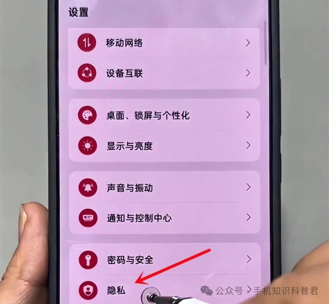 好的,朋友们。首先呢,咱们先打开手机自带的设置。好,进来之后呢,咱们往下滑找到隐私,咱们点进去。