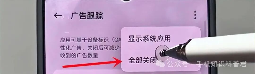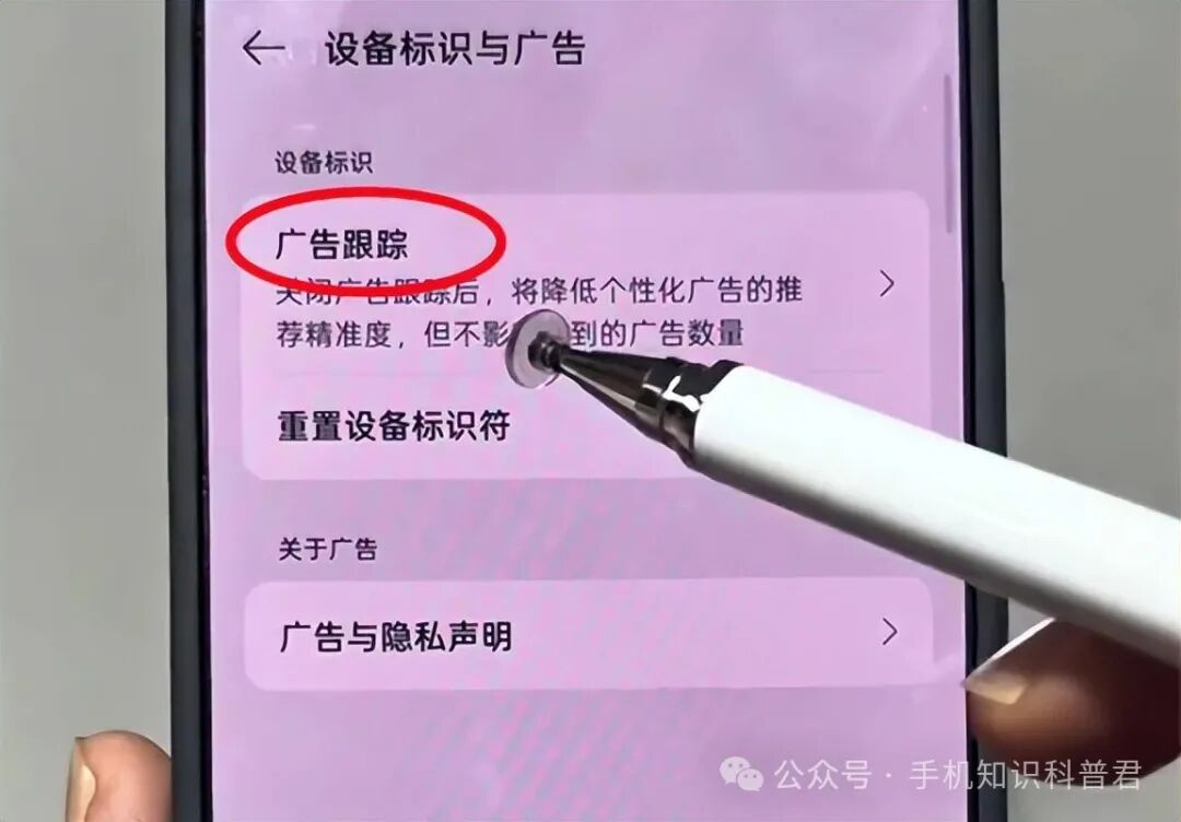 那么这个开关打开是干什么的?你看这里显示啊,应用呢可基于设备标识来跟踪个人行为和推荐个性化广告。那关闭后,可减少个人行为被跟踪。所以说这些开关哈,咱们一定要把它给关闭掉。