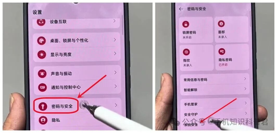 再来到设置页面哈,咱们往上滑,找到密码与安全。咱们点进来,进来之后呢,这里有一个系统安全啊,在这第二行啊,咱们往下来。