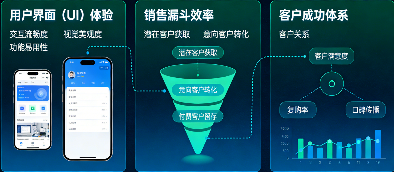 用户界面(UI)体验、销售漏斗效率、客户成功体系。