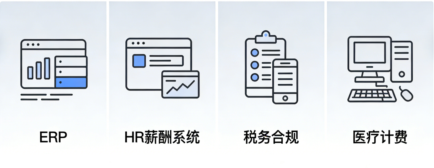 如ERP、HR薪酬系统、税务合规、医疗计费。