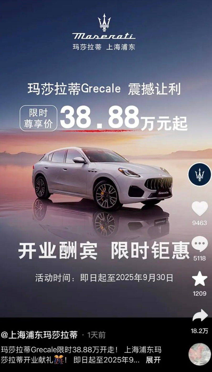 但2025年年底,玛莎拉蒂突然将官方指导价89.88万元的纯电版格雷嘉降价至38.88万,比腰斩还夸张的降价,令所有人目瞪口呆。毕竟,这么狠的降价幅度,哪怕是二手车贩子都不敢报这个价。