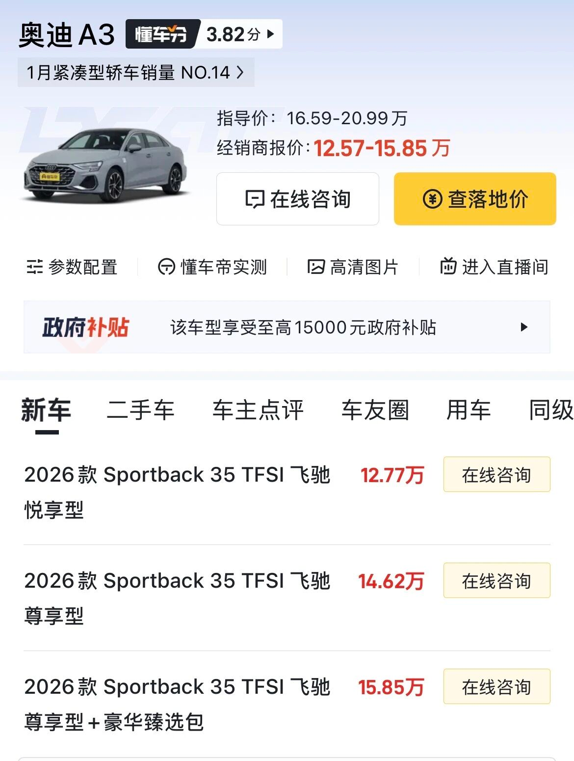 现如今,当我们打开各大汽车App,会发现奥迪A3的经销商报价已跌至12.57万——15.85万,部分4S店为了冲销量,甚至击穿地板,给出了9.9万的裸车价。
