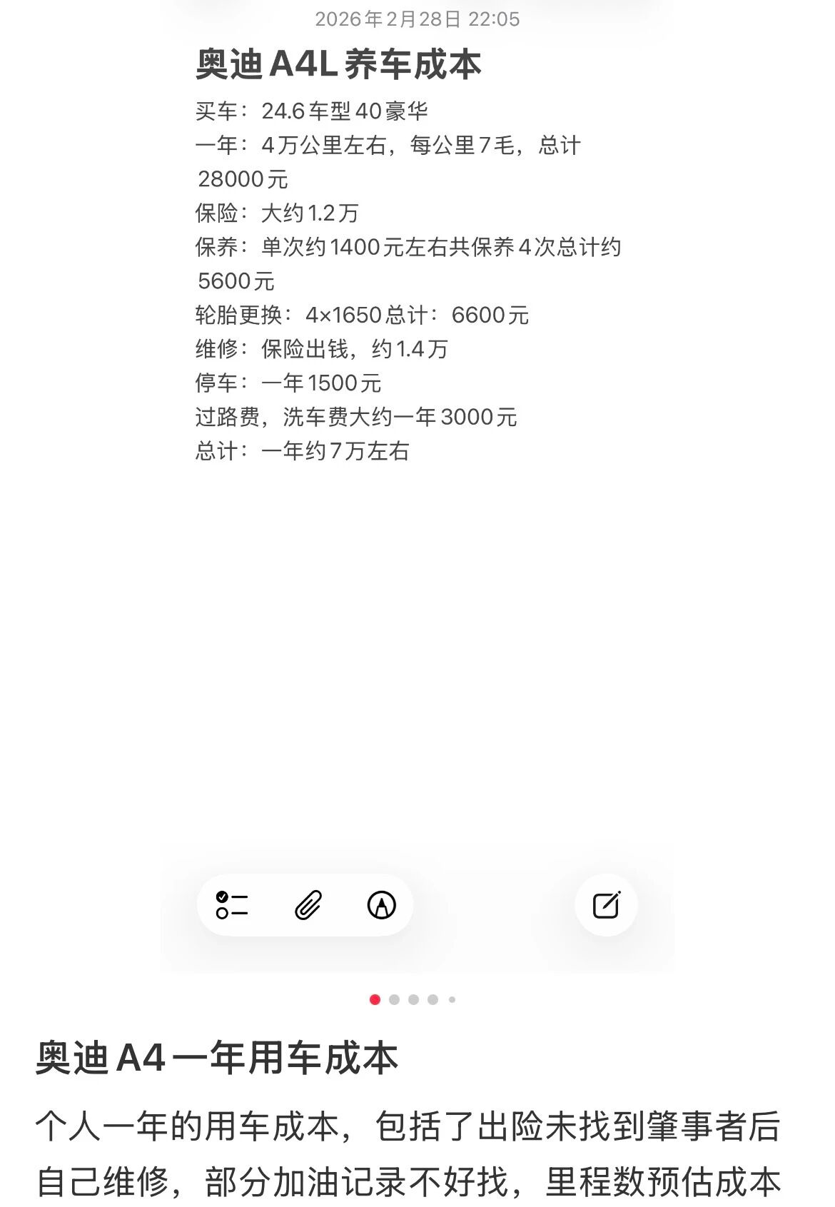 有奥迪A4L的新车主算了一笔账,他因工作原因一年要跑4万公里左右,光油费就花了2.8万元,第一年强制捆绑的保险更是高达1.2万元,再加上其他零零散散的保养、维修、停车费,一年下来,竟然砸进去7万多。