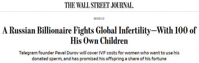 Telegram亿万富翁创始人捐精子在全世界“捐出”100个孩子,所有孩子平等继承遗产!合作诊所:现在费用全免(美中報道)